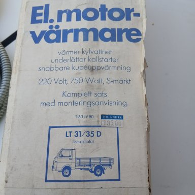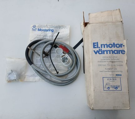 Motor verwarmingskit, gemaakt in Zweden voor de diesel motoren uit LT 31/35D. Origneel VW item 'motorvärwarme T60 19 80'